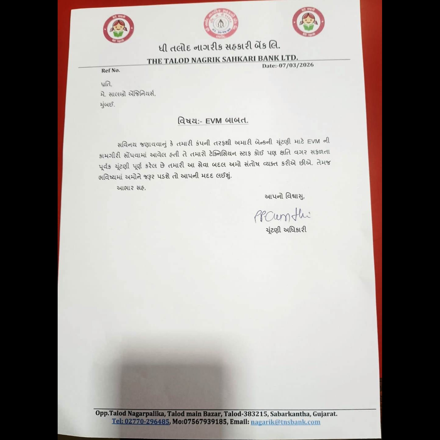 Successfully conducted election of The Talod Nagrik Sahakari Bank Ltd Gujarat on 1st March 2026. Supplied Voting machines and provided tech support. The process was smooth. Thanking Bank manager of The Talod Nagrik Sahakari Bank Ltd for the appreciation letter issued.